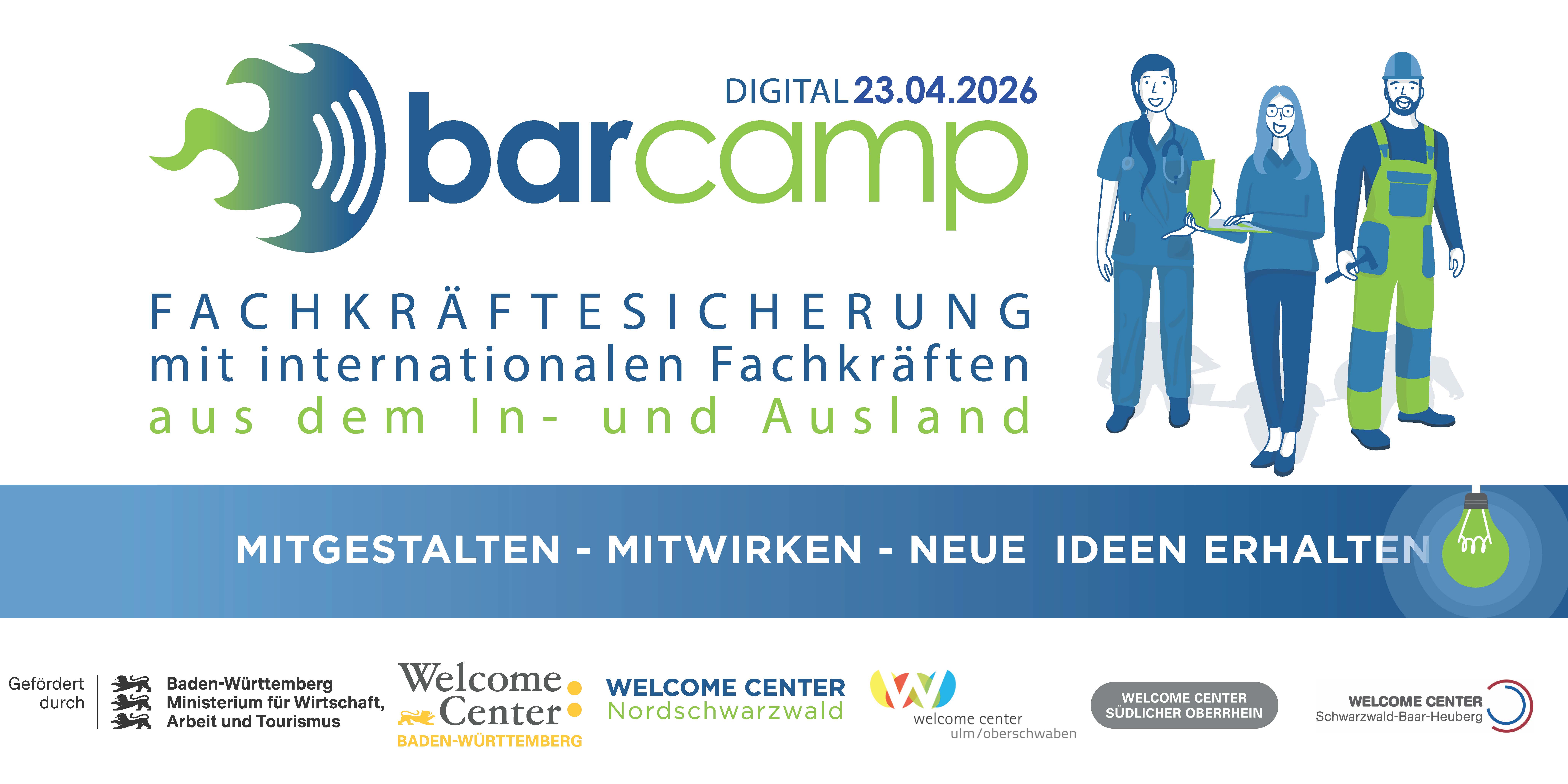 Die Welcome Center Nordschwarzwald, Schwarzwald-Baar-Heuberg/Hochrhein-Bodensee, Südlicher Oberrhein und Ulm/Oberschwaben gestalten mit Unternehmern, Personalverantwortlichen, internationalen Fachkräften und vielen regionalen Institutionen, die mit dem Thema Fachkräftesicherung betraut sind, ein digitales Barcamp.
